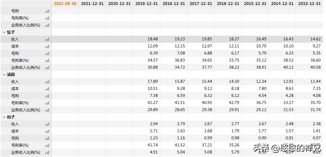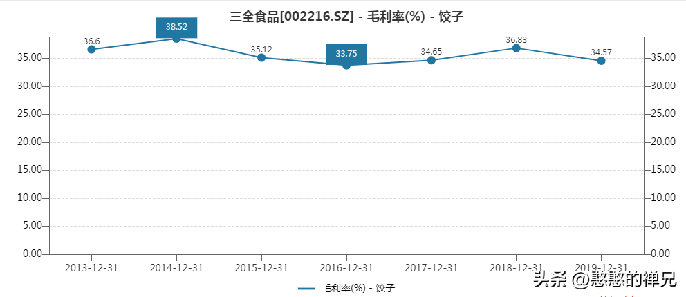 饺子的毛利率2013年-2019年维持在35%左右,毛利率最高时当达到38.52%,最低时33.75%,相对稳定。
