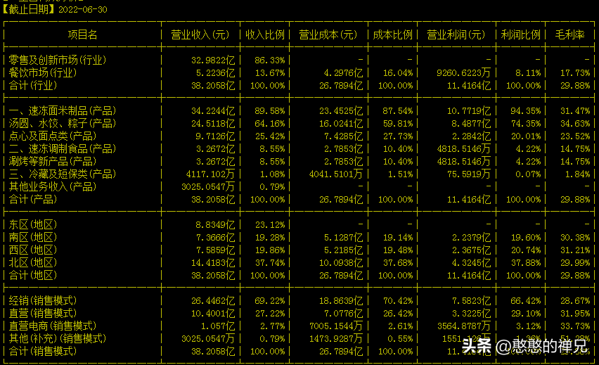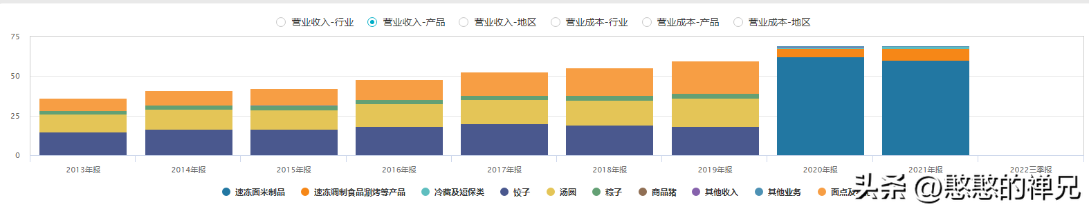 公司当前收入结构中,速冻面米制品占据了89.58%的收入比例,主要分析该类产品。