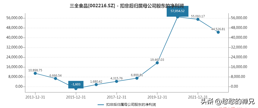 通用磨坊公司从可查到的数据年份1980年至今,涨幅17039.67%,年化收益率12.78%,持有该公司股票,稳稳的人生赢家,同时也见证了复利的伟大,年化收益率只需要12.78%,经过43年的等待,1980年的1万元到今天,可以变为170万。再看下三全食品的收益: