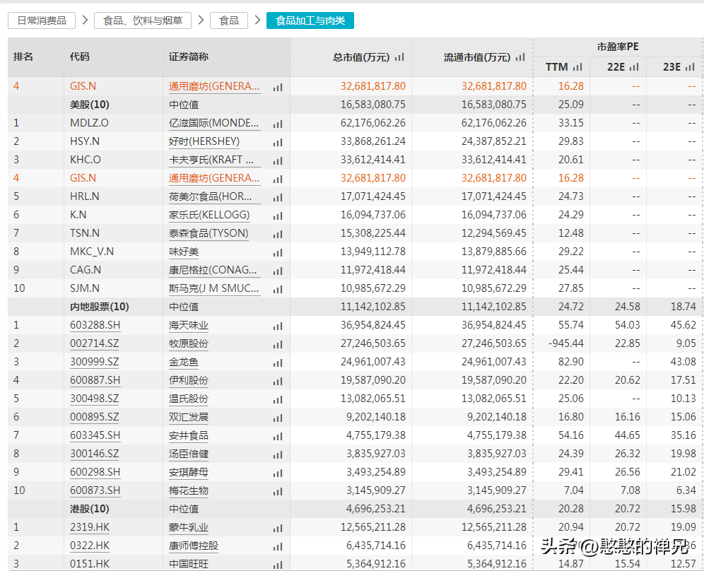通过比较美股、A股、港股食品加工与肉类上市公司的估值水平,即PE(TTM)。美股的消费企业市盈率普遍在15-30倍区间。A股的中位值在24倍,港股中位值在20倍。