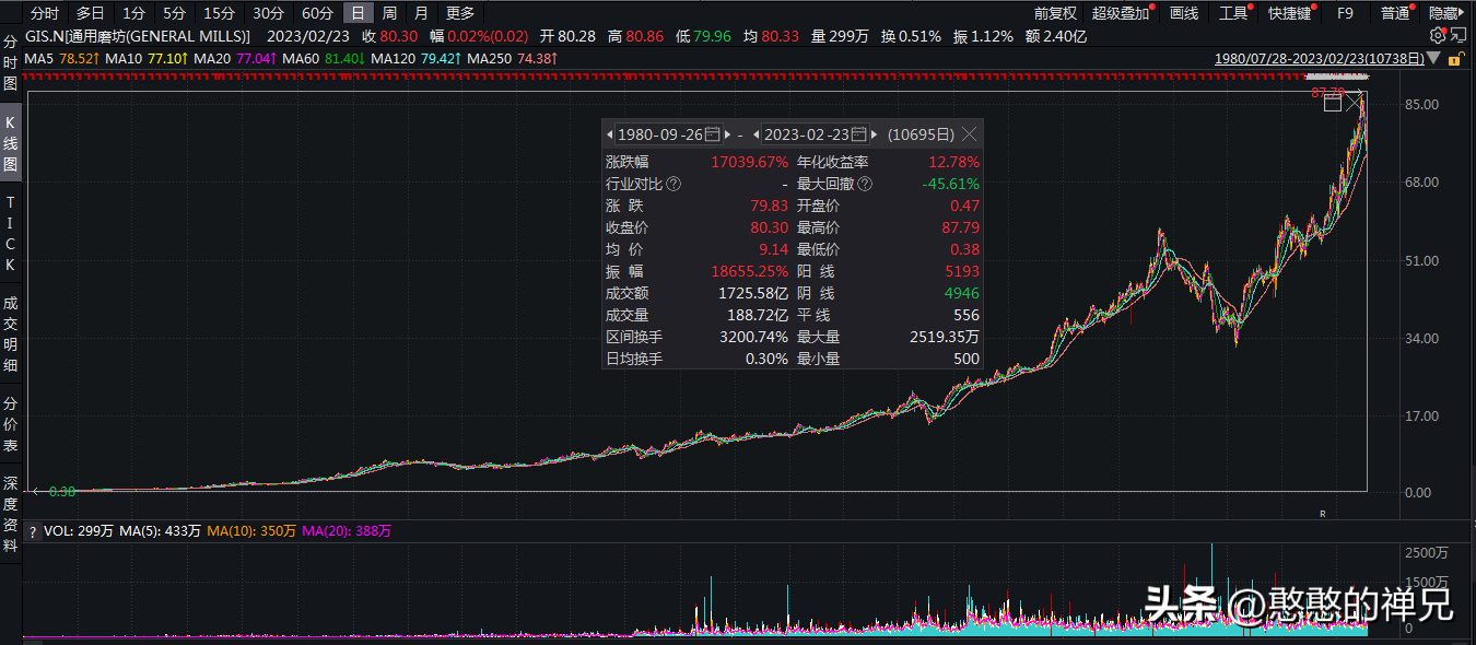 说句题外话,之前一直认为湾仔码头是香港或台湾企业,查了一下原来是米国的,属于通用磨坊公司,知名的哈格达斯冰激凌也属于通用磨坊公司,该公司也是世界500强,确实强。看看上市至今的股票走势图就知。