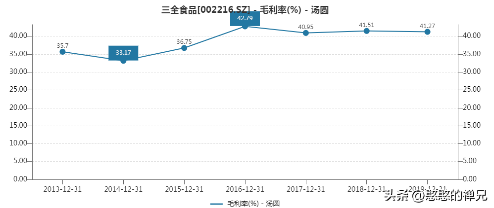 汤圆的毛利率波动较大,毛利率最高时当达到42.79%,最低时33.17%。从2016年后,常年稳定在40%以上。