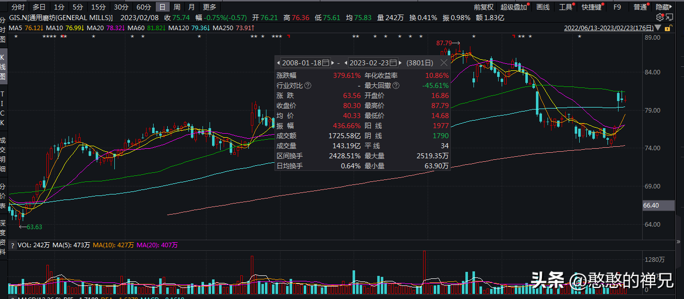 2008年上市至今,年化收益率8.15%,时间周期15年,涨跌幅214.35%。跟通用磨坊相比,相对逊色一些。(通用磨坊2008年至今,年化收益率10.86%,涨幅379.61%)。